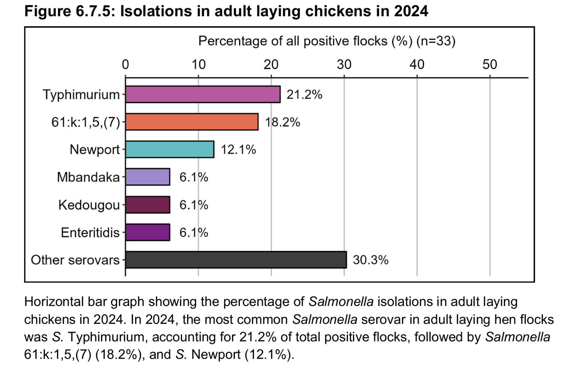 UK laying flocks remain far below EU targets, reinforcing consumer confidence in British eggs and “demonstrates continued successful control of Salmonella in the egg industry.” The recent APHA publication (25th September 2025) on Salmonella in animals and feed in Great Britain provides a retrospective account of the situation in 2024, offering valuable insight into how the poultry sector continues to manage this enduring challenge. Sixteen years after the introduction of the National Control Programme (NCP) for Salmonella, the latest figures confirm that long-term progress has been substantial.The NCP sets a target for a maximum of 2% of laying hen flocks testing positive for regulated Salmonella serovars annually and applies to all UK commercial flocks with 350 or more birds. In 2024, 33 laying hen flocks tested positive for Salmonella - an increase of 13.8% from the 29 flocks reported in 2023, but still more than halved compared with the baseline year of 2008, when the NCP was first implemented. Importantly, only 0.24% of flocks tested positive for regulated serovars (serovars of human health concern), a figure well below the statutory 2% ceiling, reaffirming the effectiveness of the national programme in keeping prevalence at consistently low levels.A closer look at the data reveals how the balance of regulated serovars has shifted. S. Enteritidis, once the most pressing concern, was identified in only two flocks in 2024, down from three the year before and a dramatic reduction from the peak of 14 in 2019. This decline reflects the success of vaccination campaigns and targeted interventions. In contrast, S. Typhimurium showed an increased to seven flocks compared with just two in 2023. While still within control limits and still at low levels, this rise highlights the pathogen’s adaptability and the need for renewed focus on management strategies. Meanwhile, no cases of monophasic S. Typhimurium were recorded in 2024, offering some reassurance.Regional variations are also noteworthy. Scotland reported no positives, while England stood at 0.26% and Wales at 0.46%. Though the numbers remain low, such differences underline the importance of locally attuned surveillance and biosecurity measures. For producers, the growth of Typhimurium is a signal that complacency is not an option; this serovar is known for its persistence in environmental reservoirs and its ability to bypass traditional controls.The report does more than catalogue prevalence. It also points to wider concerns about antimicrobial resistance, reminding the sector that even low levels of Salmonella carry long-term risks if resistant strains become more widespread. Continued vigilance, prudent antibiotic stewardship, and the refinement of pest control and vaccination strategies will be critical to staying ahead.Taken as a whole, the 2024 results illustrate both the success and the fragility of Salmonella control. The dramatic reduction since 2008 is a major achievement, reflecting the commitment of pullet rearers, producers, regulators and vets alike. While fluctuations in individual serovars are inevitable, the overall trend remains encouraging. For consumers, the message is clear: British eggs and poultry products remain among the safest in Europe. For the industry, the results reinforce the value of sustained investment in biosecurity and demonstrate how collective action delivers long-term gains.Regulated serovarsIn terms of the detail, 9 flocks tested positive for regulated serovars — slightly up from 7 in 2023, but well below the 2019 peak of 16. The detail is as follows:• S. Enteritidis: 2 flocks (down from 3 in 2023; down from 14 in 2019)• S. Typhimurium: 7 flocks (up from 2 in 2023)• Monophasic S. Typhimurium: 0 flocks (down from 1 in 2023)In terms of the prevalence of regulated serovars:• GB overall: 0.24% (9 of 3,700 flocks)• England: 0.26%• Wales: 0.46%• Scotland: 0.00%All remain well below the 2% target.