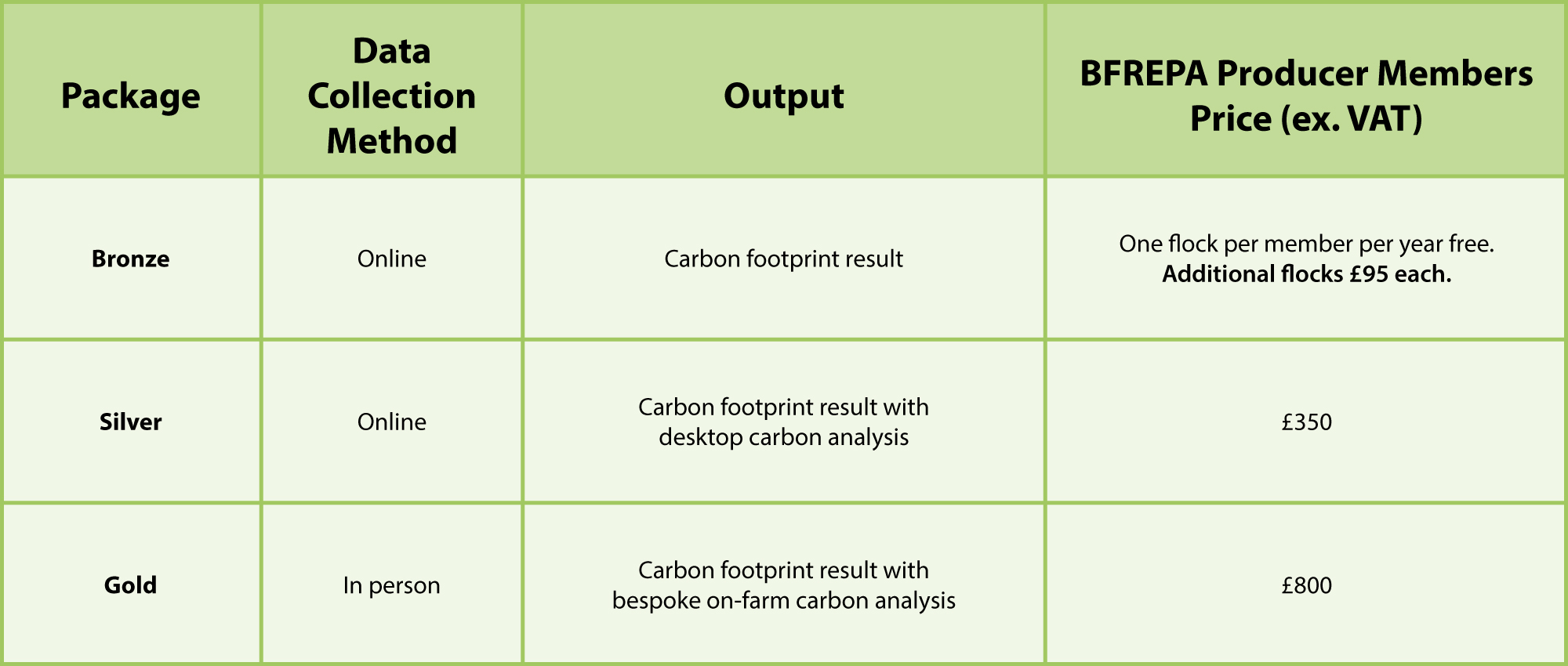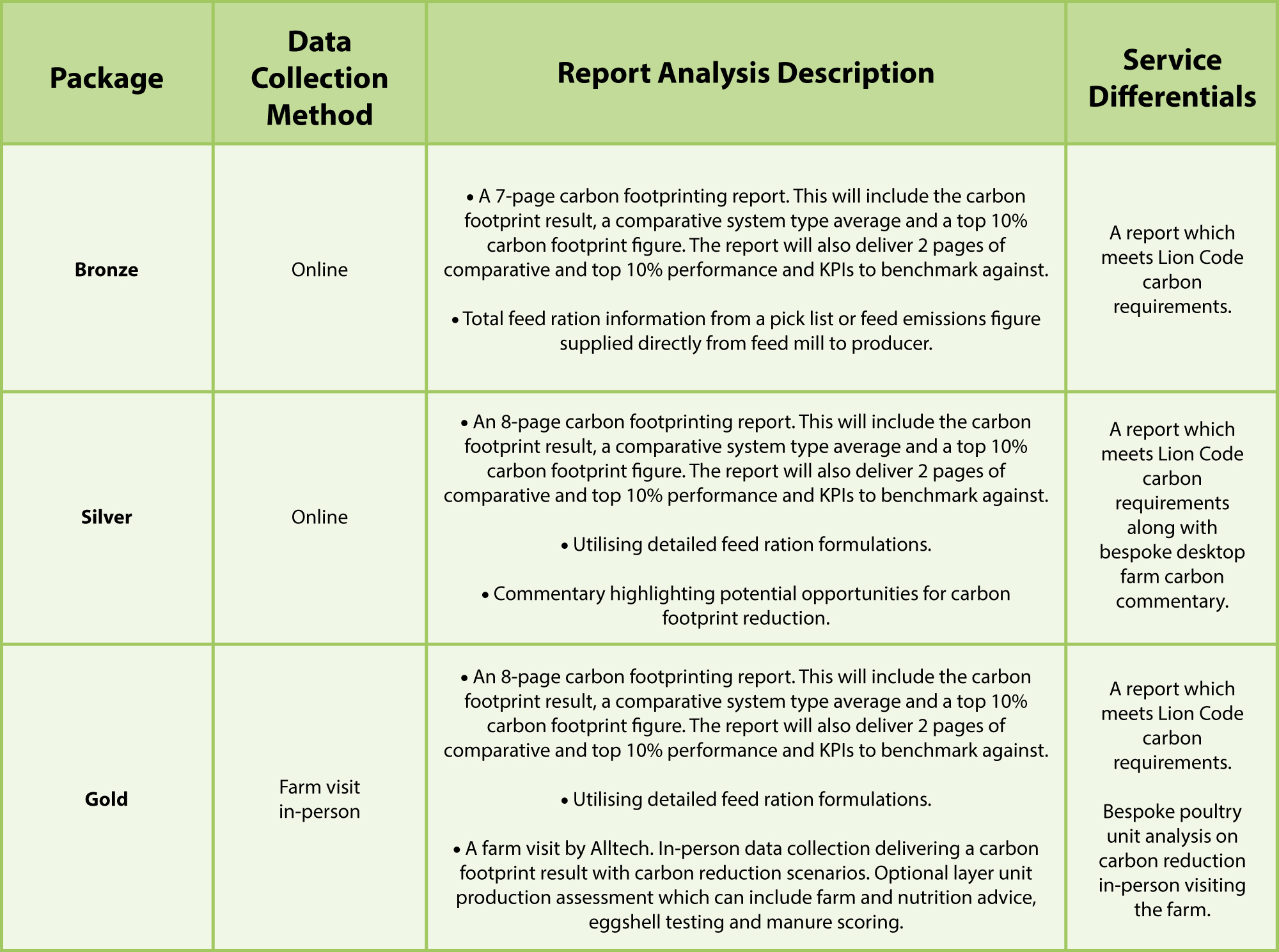 Only the bronze option is offered as free membership benefit for one flock per year to BFREPA producer members, however BFREPA have partnered with Alltech to also provide discounted options for those members who want to know and understand more about their carbon footprint or receive a more personalised service with Alltech.