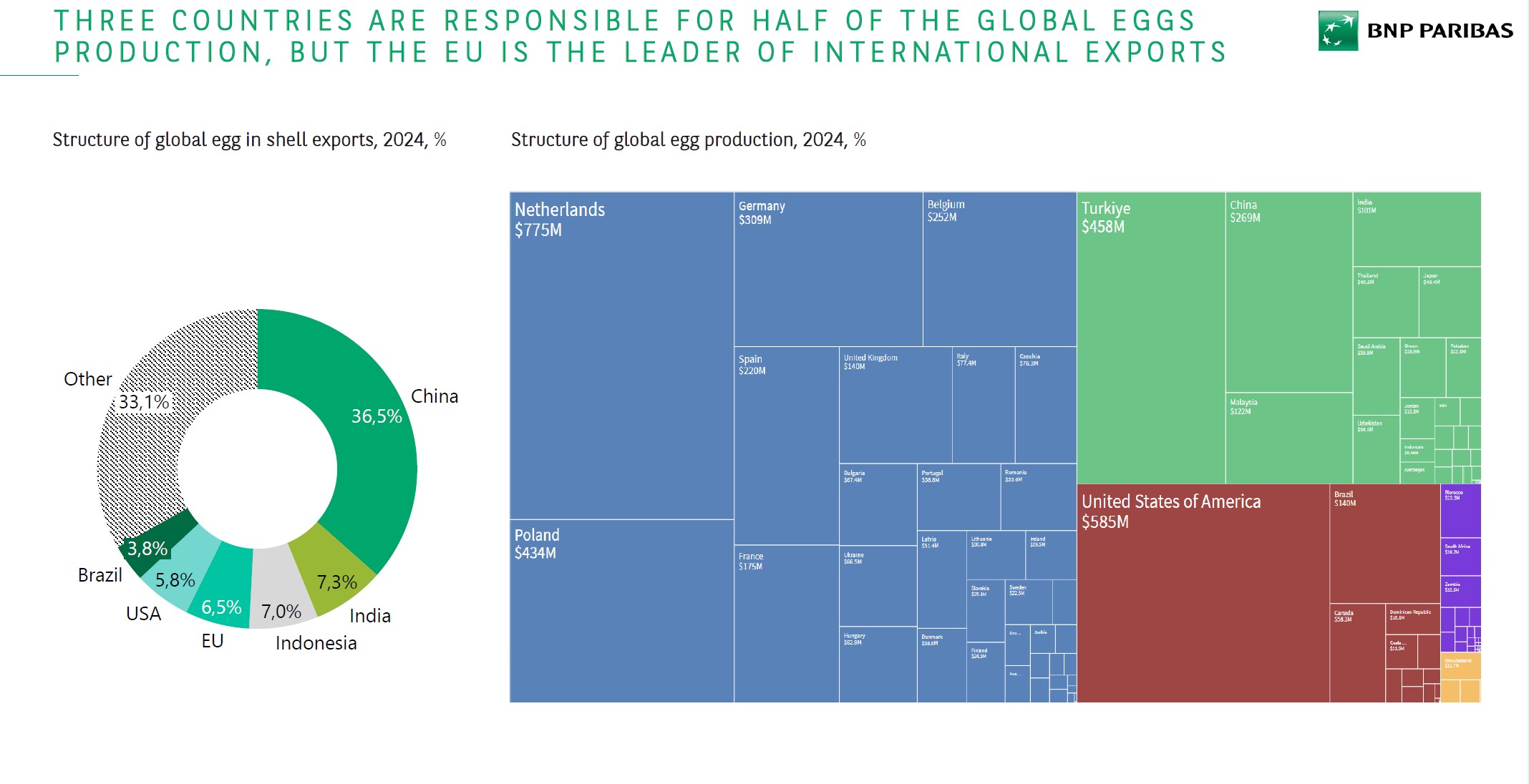 Global output is still forecast to rise, driven by population growth and increasing incomes, particularly in Asia and Africa. However, Kowalewska pointed to a clear slowdown in growth rates. Production is expected to move from roughly 99 million tonnes today to around 109 million tonnes by 2034, equivalent to growth of around 1.1 percent per year, compared with higher rates seen previously. Much of that increase is concentrated in Asia and Africa, where both production and consumption are rising in parallel, rather than export driven expansion.The structure of global supply remains highly concentrated. China alone accounts for more than a third of global production, with India, the EU, Indonesia and the United States forming the next tier. Despite that, the EU remains the leading exporter of eggs internationally, highlighting the gap between production concentration and trade leadership.