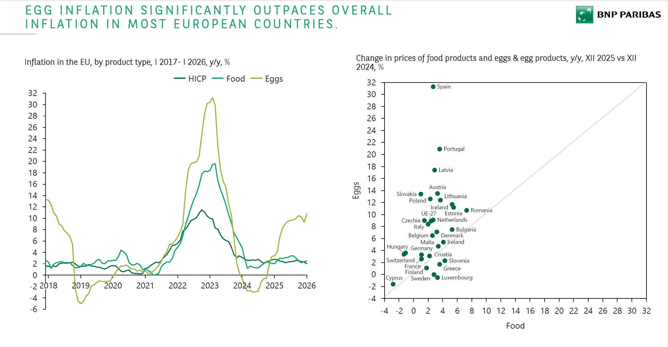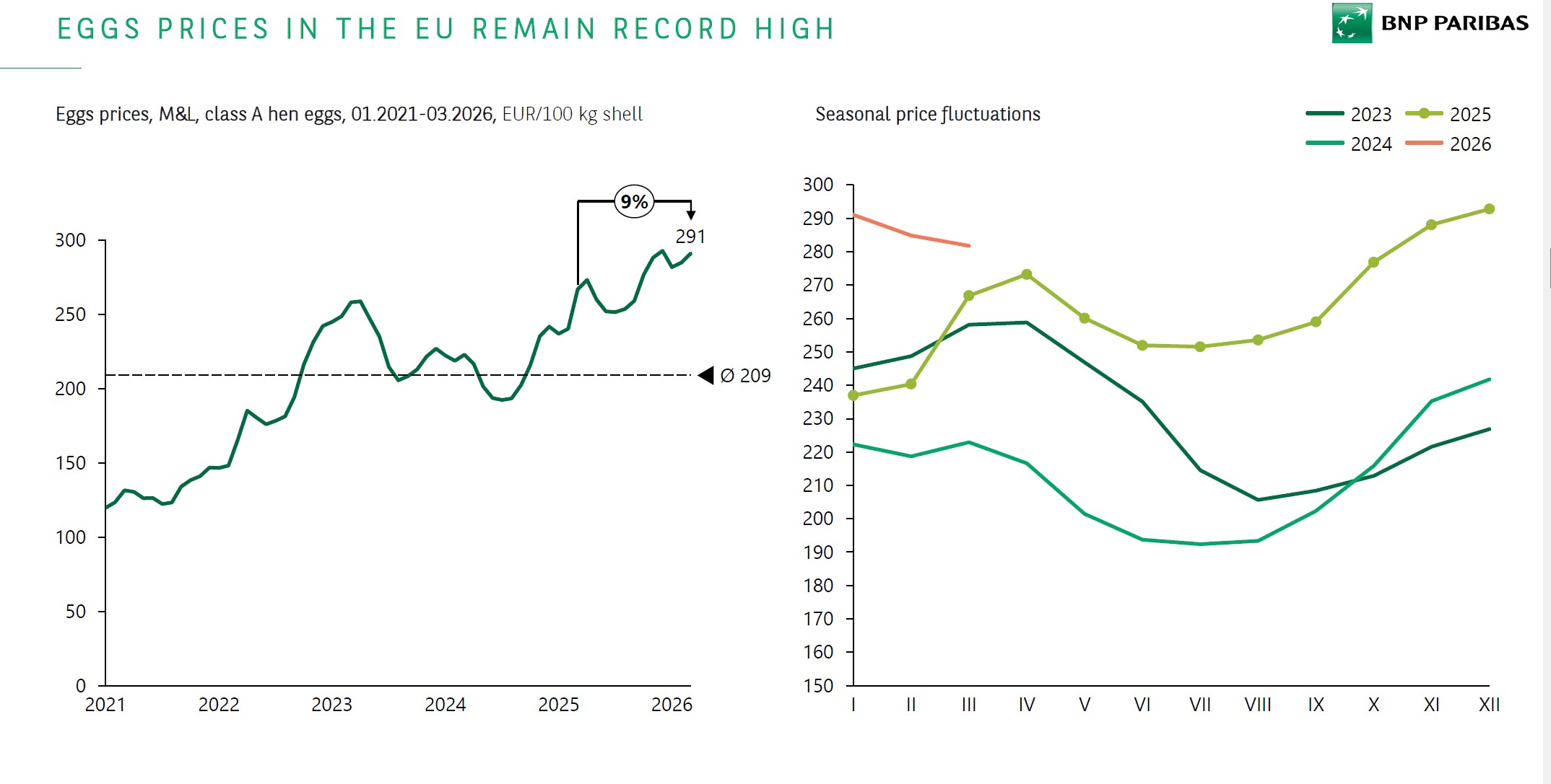 Disease continues to constrain supply in several regions. Avian influenza remains the dominant challenge, alongside Newcastle disease and salmonella. Mapping presented during the session showed ongoing outbreaks across Europe and North America, underlining the persistent nature of the risk rather than a one off event.Across the European Union, prices remain elevated by historical standards. EU egg prices have reached close to €300 per 100kg in recent cycles, with average levels still sitting well above long term norms. Inflation in eggs has also outpaced broader food inflation across most member states, with some countries seeing double digit increases where overall food inflation has been significantly lower.