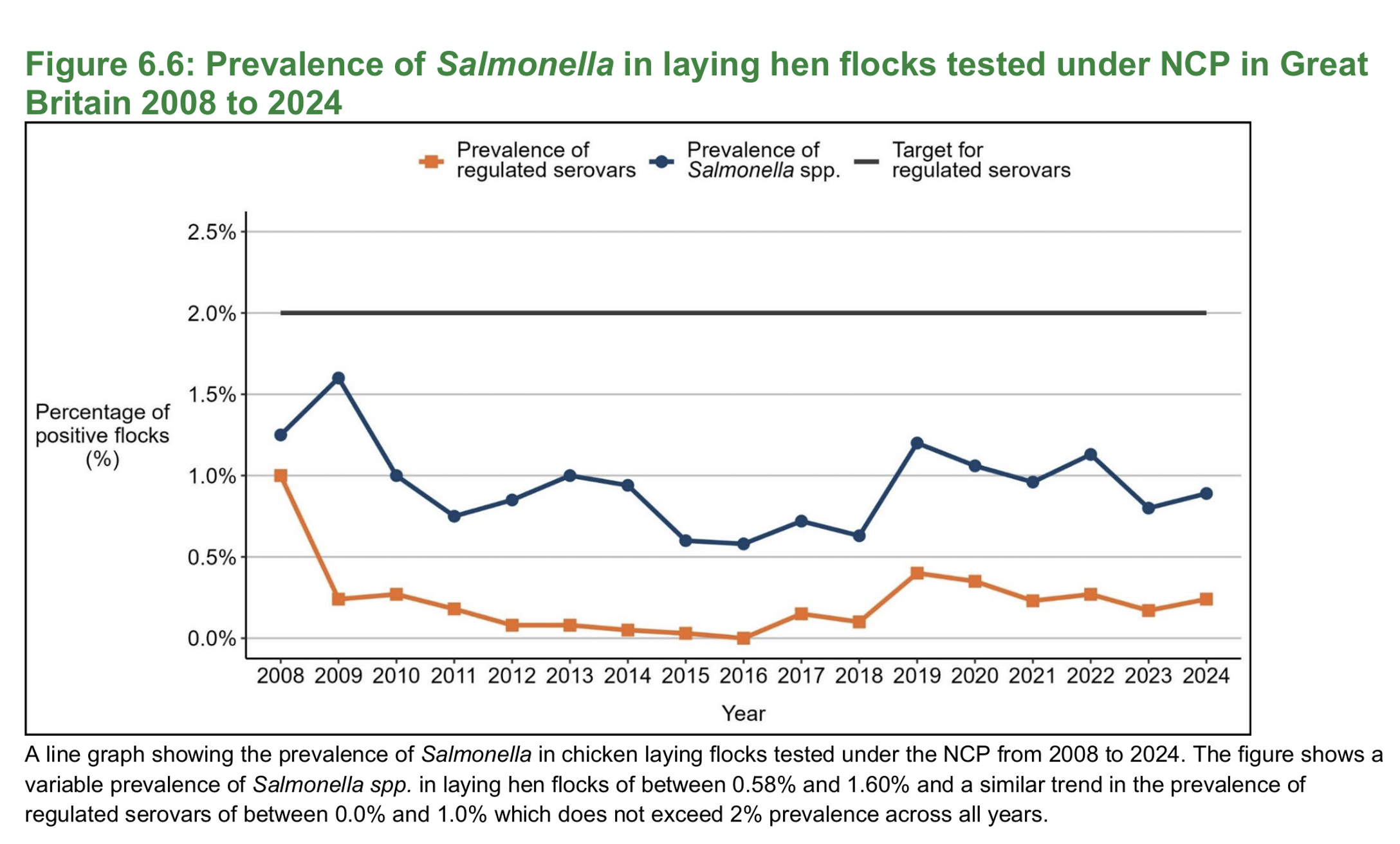 UK laying flocks remain far below EU targets, reinforcing consumer confidence in British eggs and “demonstrates continued successful control of Salmonella in the egg industry.” The recent APHA publication (25th September 2025) on Salmonella in animals and feed in Great Britain provides a retrospective account of the situation in 2024, offering valuable insight into how the poultry sector continues to manage this enduring challenge. Sixteen years after the introduction of the National Control Programme (NCP) for Salmonella, the latest figures confirm that long-term progress has been substantial.The NCP sets a target for a maximum of 2% of laying hen flocks testing positive for regulated Salmonella serovars annually and applies to all UK commercial flocks with 350 or more birds. In 2024, 33 laying hen flocks tested positive for Salmonella - an increase of 13.8% from the 29 flocks reported in 2023, but still more than halved compared with the baseline year of 2008, when the NCP was first implemented. Importantly, only 0.24% of flocks tested positive for regulated serovars (serovars of human health concern), a figure well below the statutory 2% ceiling, reaffirming the effectiveness of the national programme in keeping prevalence at consistently low levels.A closer look at the data reveals how the balance of regulated serovars has shifted. S. Enteritidis, once the most pressing concern, was identified in only two flocks in 2024, down from three the year before and a dramatic reduction from the peak of 14 in 2019. This decline reflects the success of vaccination campaigns and targeted interventions. In contrast, S. Typhimurium showed an increased to seven flocks compared with just two in 2023. While still within control limits and still at low levels, this rise highlights the pathogen’s adaptability and the need for renewed focus on management strategies. Meanwhile, no cases of monophasic S. Typhimurium were recorded in 2024, offering some reassurance.Regional variations are also noteworthy. Scotland reported no positives, while England stood at 0.26% and Wales at 0.46%. Though the numbers remain low, such differences underline the importance of locally attuned surveillance and biosecurity measures. For producers, the growth of Typhimurium is a signal that complacency is not an option; this serovar is known for its persistence in environmental reservoirs and its ability to bypass traditional controls.The report does more than catalogue prevalence. It also points to wider concerns about antimicrobial resistance, reminding the sector that even low levels of Salmonella carry long-term risks if resistant strains become more widespread. Continued vigilance, prudent antibiotic stewardship, and the refinement of pest control and vaccination strategies will be critical to staying ahead.Taken as a whole, the 2024 results illustrate both the success and the fragility of Salmonella control. The dramatic reduction since 2008 is a major achievement, reflecting the commitment of pullet rearers, producers, regulators and vets alike. While fluctuations in individual serovars are inevitable, the overall trend remains encouraging. For consumers, the message is clear: British eggs and poultry products remain among the safest in Europe. For the industry, the results reinforce the value of sustained investment in biosecurity and demonstrate how collective action delivers long-term gains.Regulated serovarsIn terms of the detail, 9 flocks tested positive for regulated serovars — slightly up from 7 in 2023, but well below the 2019 peak of 16. The detail is as follows:• S. Enteritidis: 2 flocks (down from 3 in 2023; down from 14 in 2019)• S. Typhimurium: 7 flocks (up from 2 in 2023)• Monophasic S. Typhimurium: 0 flocks (down from 1 in 2023)In terms of the prevalence of regulated serovars:• GB overall: 0.24% (9 of 3,700 flocks)• England: 0.26%• Wales: 0.46%• Scotland: 0.00%All remain well below the 2% target.
